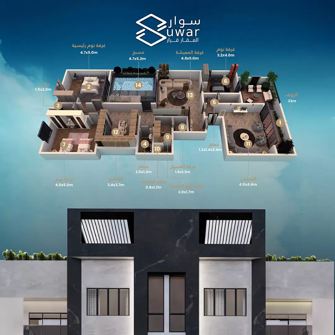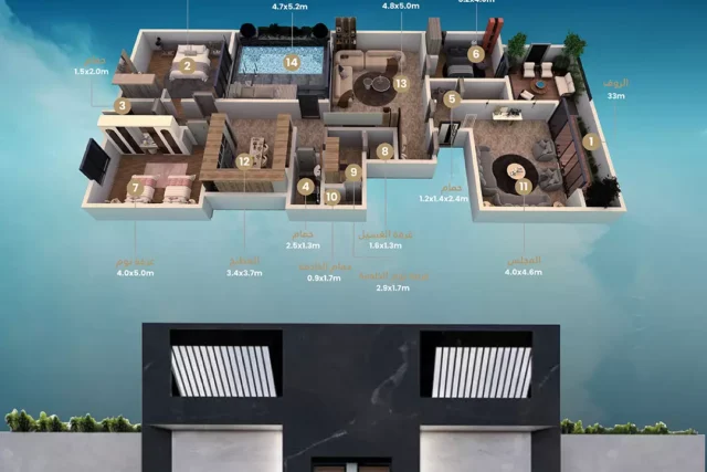 🔹 روف مميز يحتوي على مسبح للاسترخاء والاستجمام.