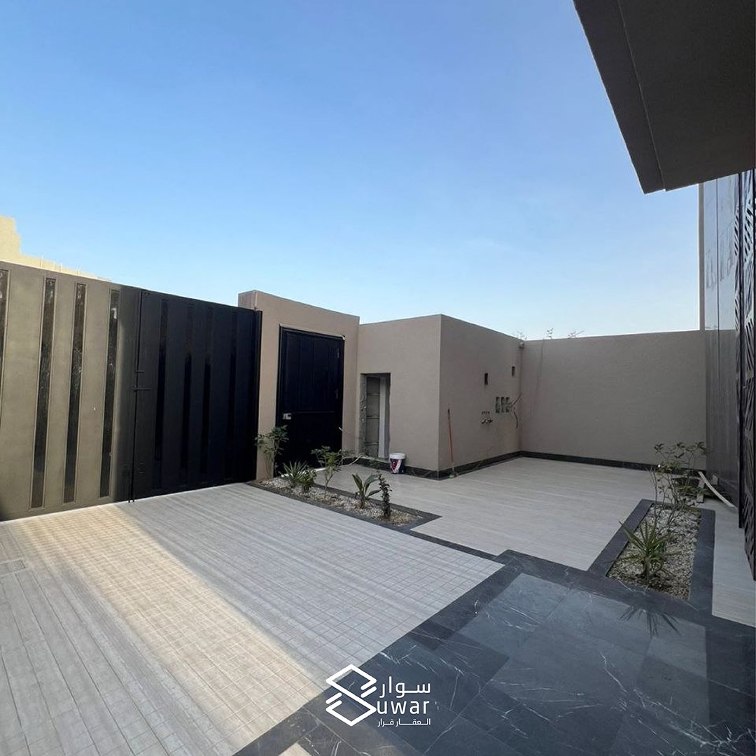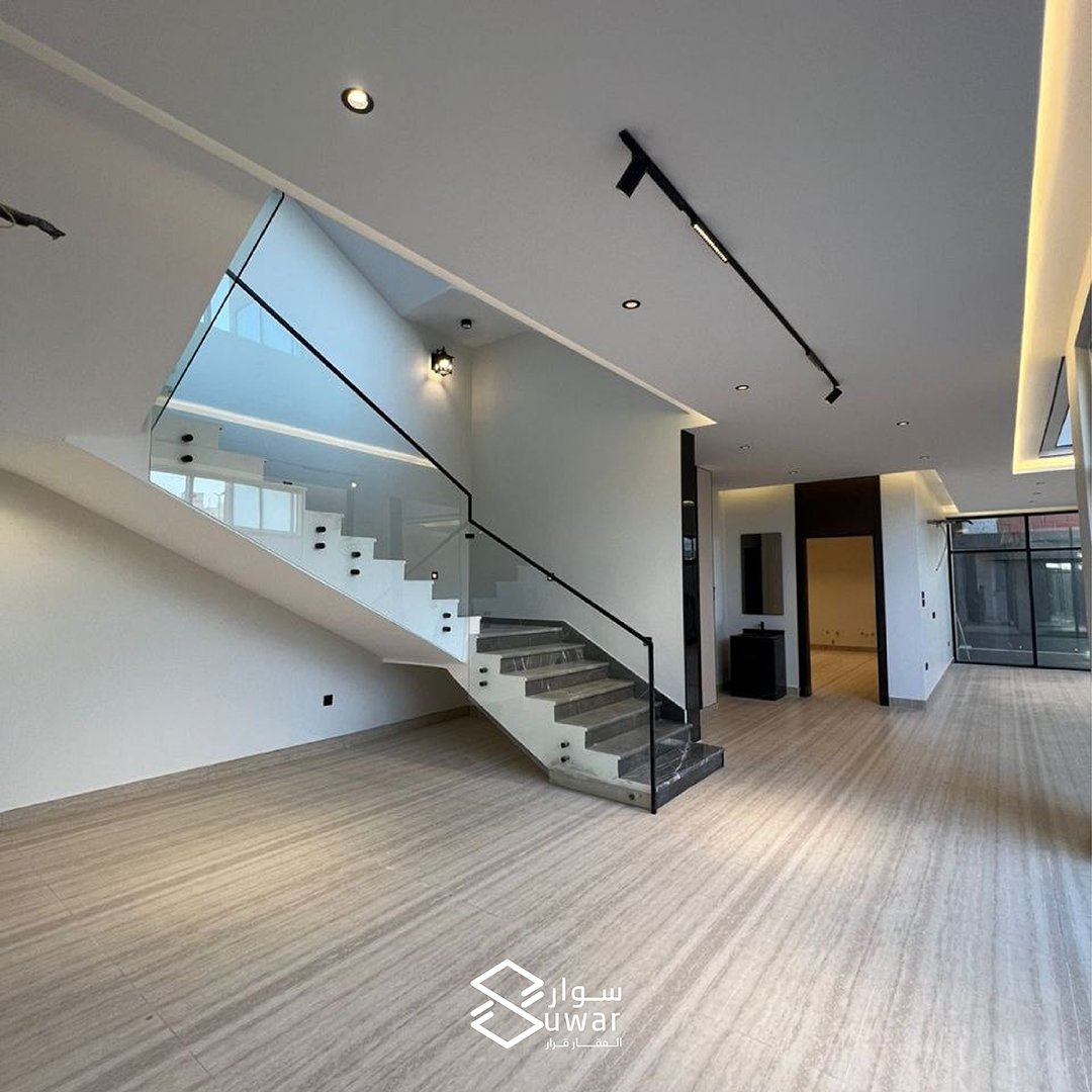 الدور الارضي : مجلس رجال + مقلط + دورة مياة + صالة كبيرة + مطبخ + دورة مياة + شلال جلسه خلفيه + مسبح